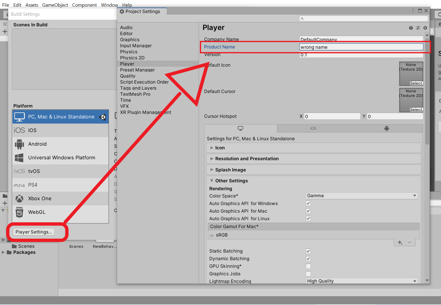 빌드되는 이름을 바꾸고 싶다면 Buildsttings 에서 player settings...에 들어가 Procutname을 바꿔주면 됩니다.